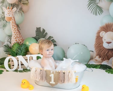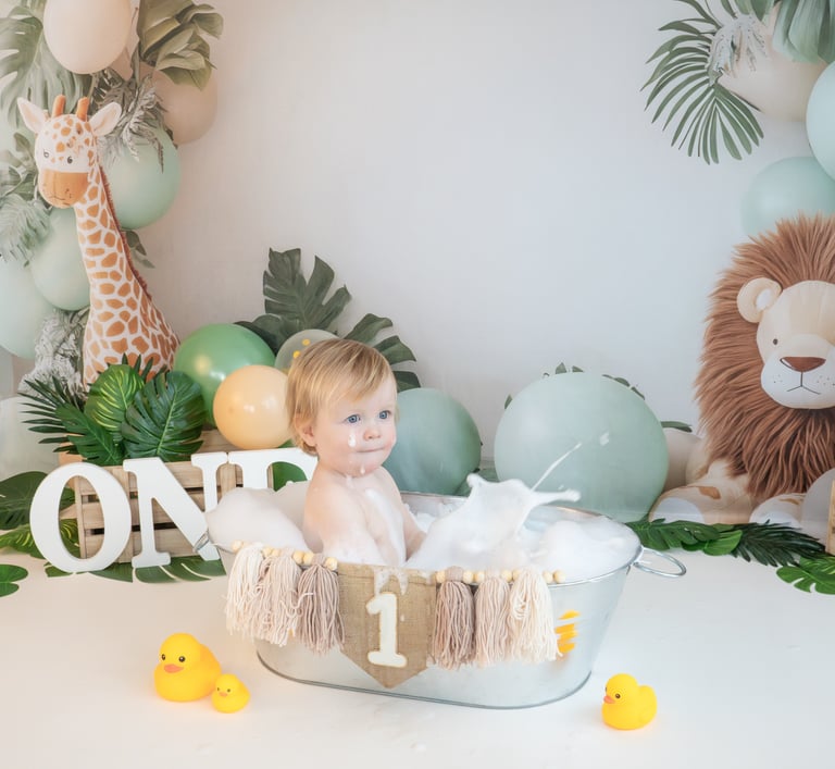 For full cake smash & splash sessions, we finish with a warm bath and bubbles to clean up and capture happy, splashy smiles.